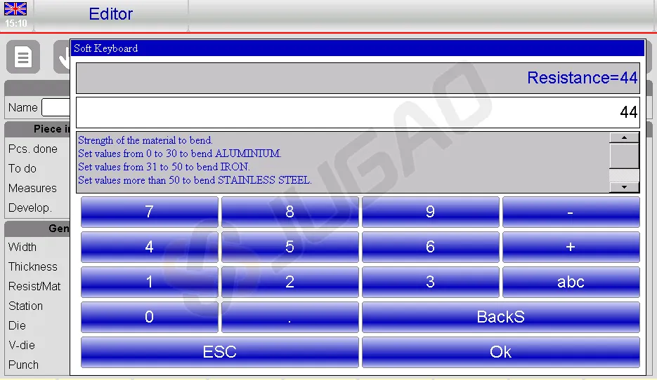 l Metal Sheet Width: Tap the field, input the width, and select [Ok].
